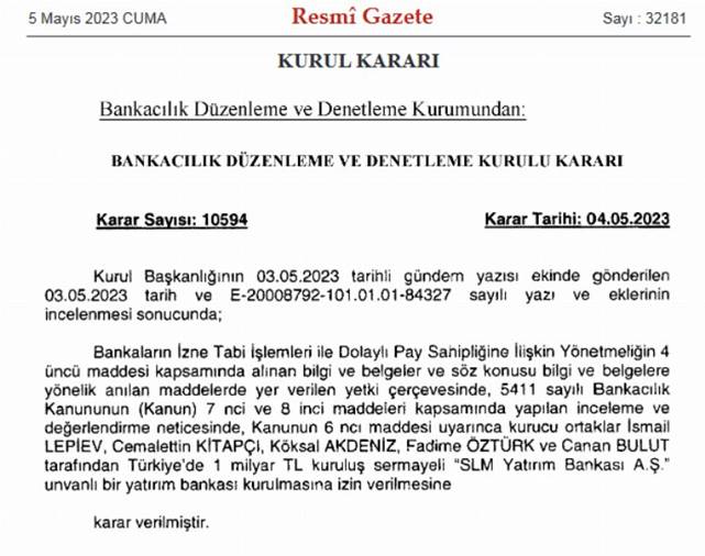 ANKARA (İGFA) - BDDK, kurucu ortakları İsmail Lepiev, Cemalettin Kitapçı, Köksal Akdeniz, Fadime Öztürk ve Canan Bulut tarafından Türkiye'de 1 milyar TL kuruluş sermayeli "SLM Yatırım Bankası AŞ" unvanlı bir yatırım bankası kurulmasına izin verdi.
