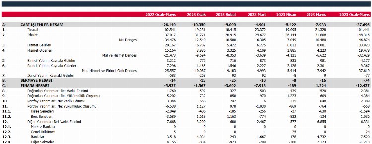 Mayıs ayında cari işlemler hesabı 7 bin 933 milyon ABD doları açık kaydederken, altın ve enerji hariç cari işlemler hesabı ise bin 283 milyon ABD doları açık verdi.