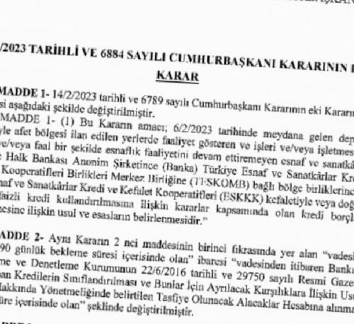 Hatırlanacağı gibi kararla; depremler dolayısıyla afet bölgesi ilan edilen yerlerde faaliyet gösteren işleri ve işletmesi zarar gören veya faal bir şekilde esnaflık faaliyetini devam ettiremeyen esnaf ve sanatkarların, Halkbank tarafından Türkiye Esnaf ve Sanatkarlar Kredi ve Kefalet Kooperatifleri Birlikleri Merkez Birliğine (TESKOMB) bağlı bölge birliklerine ortak olan Esnaf ve Sanatkarlar Kredi ve Kefalet Kooperatifleri (ESKKK) kefaletiyle veya doğrudan düşük faizli kredi kullandırılmasına ilişkin kararlar kapsamında kredi borçları ertelenmişti.