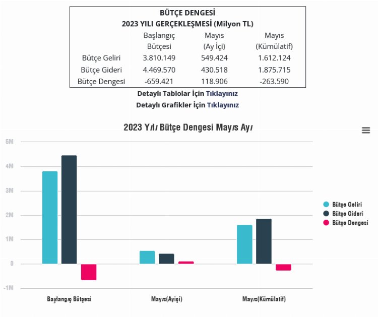 2023 yılı Ocak-Mayıs döneminde merkezi yönetim bütçe giderleri 1 trilyon 875,7 milyar TL, bütçe gelirleri 1 trilyon 612,1 milyar TL ve bütçe açığı 263,6 milyar TL olarak gerçekleşti.