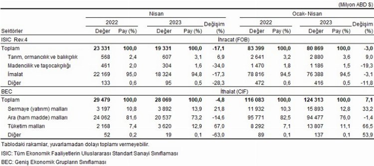 TÜİK ve Ticaret Bakanlığı iş birliğiyle genel ticaret sistemi kapsamında üretilen geçici dış ticaret verilerinden aktardığına göre; ihracat Nisan ayında, bir önceki yılın aynı ayına göre yüzde 17,1 azalarak 19,33 milyar dolar, ithalat yüzde 4,8 azalarak 28,69 milyar dolar oldu.