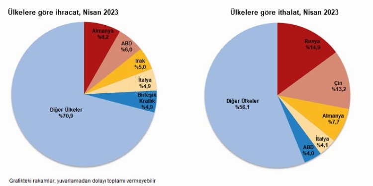 Nisan ayında ihracatta ilk sırayı Almanya aldı. Almanya'ya yapılan ihracat 1 milyar 590 milyon dolar olurken, bu ülkeyi sırasıyla; 1 milyar 163 milyon dolar ile ABD, 970 milyon dolar ile Irak, 954 milyon dolar ile İtalya, 945 milyon dolar ile Birleşik Krallık takip etti. İlk 5 ülkeye yapılan ihracat, toplam ihracatın %29,1'ini oluşturdu.