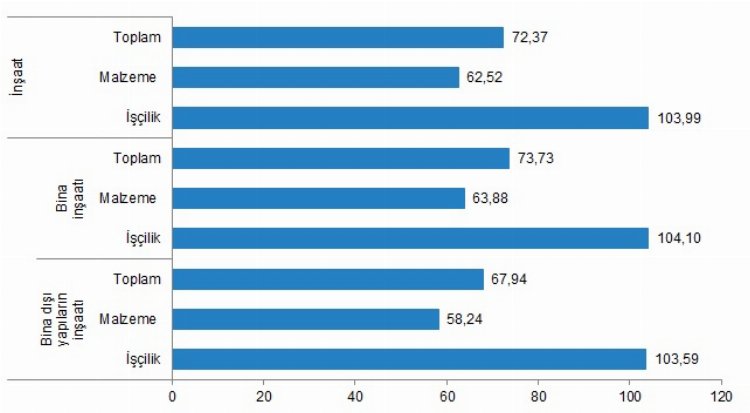 Bir önceki aya göre malzeme endeksi yüzde 3,43 artarken, işçilik endeksi yüzde 1,20 azaldı. Ayrıca bir önceki yılın aynı ayına göre malzeme endeksi yüzde 62,52, işçilik endeksi yüzde 103,99 arttı.