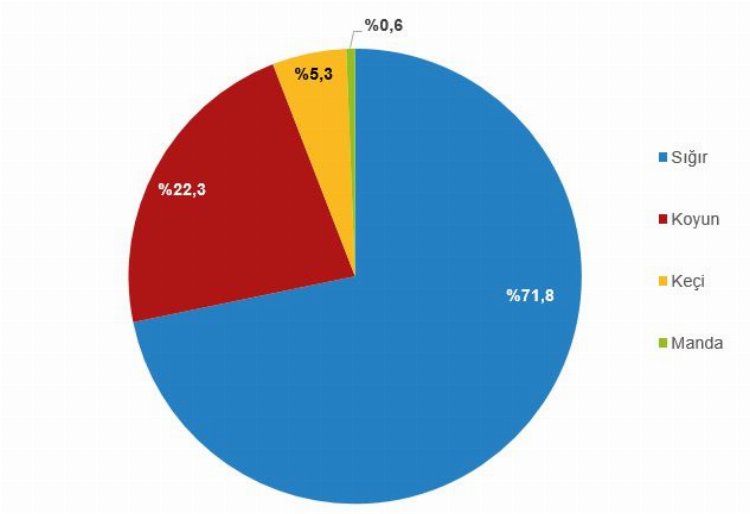 Bu kapsamda bir önceki yıla göre sığır eti üretimi yüzde 7,7 artarak 1 milyon 572 bin 747 ton, koyun eti üretimi yüzde 26,8 artarak 489 bin 354 ton, keçi eti üretimi yüzde 22,6 artarak 115 bin 938 ton, manda eti üretimi ise yüzde 25,4 artarak 13 bin 586 ton oldu.
