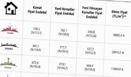 Endeks değerleri bir önceki yılın aynı ayına göre, İstanbul, Ankara ve İzmir’de sırasıyla yüzde 154,4, 156,8 ve 149,9 oranlarında artış gösterirken, bir önceki yılın aynı ayına göre yüzde