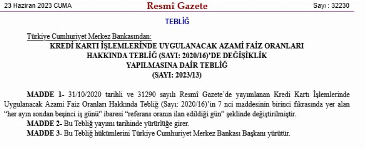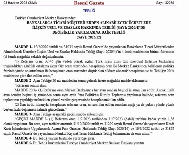 Merkez Bankası tarafından daha önce yayımlanan tebliğe göre 1 Ağustos tarihinden itibaren geçerli olacağı duyurulan faiz artışı, Bankalarca Ticari Müşterilerden Alınabilecek Ücretlere İlişkin Usul ve Esaslar Hakkında Tebliğ’de yapılan değişiklik Temmuz tarihine çekildi.