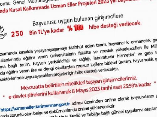 8 Mayıs 2023 tarihi saat 23.59'a kadar başvuruların kabule dileceği projeye https://uzmaneller.tarimorman.gov.tr adresi üzerinden online olarak başvurulabileceği bildirildi.