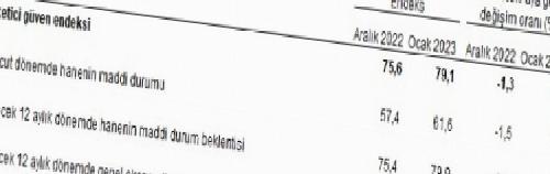 TÜİK ve Merkez Bankası işbirliği ile yürütülen tüketici eğilim anketi sonuçlarından hesaplanan Tüketici Güven Endeksi, Ocak ayında bir önceki aya göre yüzde 4,6 oranında artarken, Aralık ayında 75,6 olan endeks, Ocak ayında 79,1 oldu.