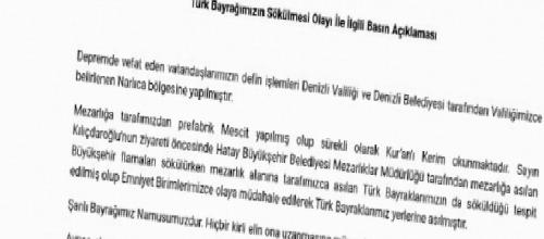 HATAY (İGFA) - Hatay Valiliği, mezarlıkta Türk Bayrağı'nın sökülmesiyle ilgli yazılı basın açıklaması yaptı.