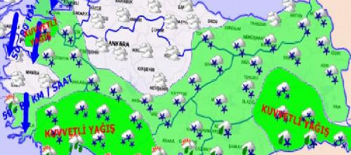 Kıyı kesimlerde yağmur ve sağanak; yağış alan diğer yerlerde karla karışık yağmur ve kar şeklinde görülmesi beklenen yağışların, Akdeniz, Doğu Anadolu'nun güneyi, Güneydoğu Anadolu ile Balıkesir, Bursa, Afyonkarahisar, Denizli, Konya, Karaman çevreleri ile İstanbul'un kuzeybatısı ve Kırklareli'nin doğusunda kuvvetli yağış ve yer yer yoğun kar yağışı şeklinde olması bekleniyor.