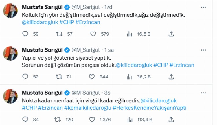 Sarıgül, CHP Genel Başkanı Kemal Kılıçdaroğlu'nu etiketleyerek yaptığı paylaşımlarında, "Nokta kadar menfaat için virgül kadar eğilmedik", "Yapıcı ve yol gösterici siyaset yaptık. Sorunun değil çözümün parçası olduk", "Koltuk için yön değiştirmedik, saf değiştirmedik, ağız değiştirmedik" ifadelerini kullandı.