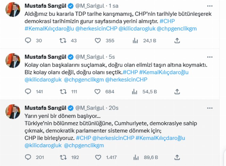 Sarıgül, "Aldığımız bu kararla TDP tarihe karışmamış, CHP’nin tarihiyle bütünleşerek demokrasi tarihimizin gurur sayfasında yerini almıştır" ifadelerini kullandı.