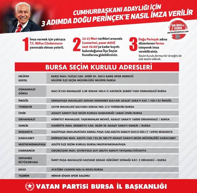 Bursa İl Başkanı Dilek Çınar, Nilüfer Seçim Kurulu önünde yaptığı açıklamada, İlçe Seçim Kurulları önünde ve Şekreküstü, Nilüfer, Küçük Sanayi’de açacağımız masalarda tek tek vatandaşlara 'Neden Doğu Perinçek’e imza vermeleri gerektiğini' anlattıklarını söyledi.