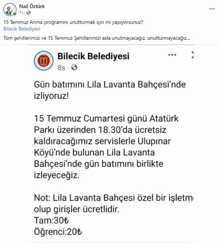 CHP’li Bilecik Belediyesi yaptığı paylaşım ile 15 Temmuz Cumartesi günü vatandaşları Ulupınar köyünde bulunan lavanta bahçelerinde gün batımı izlemeye davet ederken Bilecik Belediyesine ilk tepki AK Parti Bilecik Merkez İlçe Başkanı Nail Öztürk’ten geldi.
