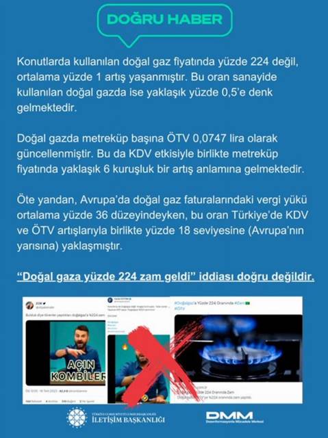 Konutlarda kullanılan doğal gaz fiyatında yüzde 224 değil, ortalama yüzde 1 artış yaşandığını açıklayan Dezenformasyonla Mücadele Merkezi, "Bu oran sanayide kullanılan doğal gazda ise yaklaşık yüzde 0,5’e tekabül etmektedir" dedi.