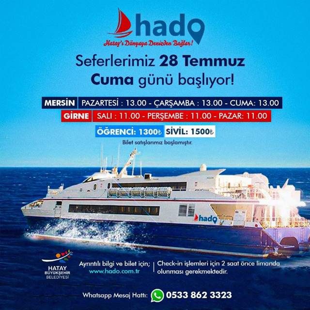 Türkiye’de belediye eliyle ilk uluslararası deniz yolcu taşımacılığı yapan Hatay Büyükşehir Belediyesi bünyesindek Hatay Deniz Otobüsü (HADO), ilk seferlerine Mersin Taşucu’ndan başlıyor.