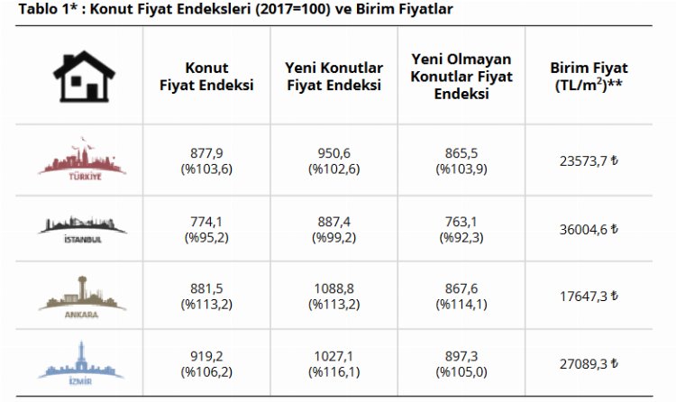 İstanbul, Ankara ve İzmir’in konut fiyat endekslerindeki gelişmeler değerlendirildiğinde, 2023 yılı Mayıs ayında bir önceki aya göre, sırasıyla yüzde 2,8, 5,6 ve 3,2 oranlarında artış gözlenirken, endeks değerleri bir önceki yılın aynı ayına göre, İstanbul, Ankara ve İzmir’de sırasıyla yüzde 95,2, 113,2 ve 106,2 oranlarında arttı.