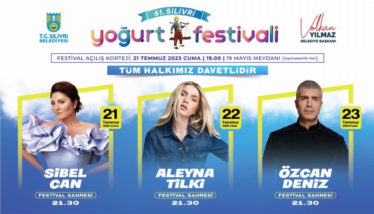 61. Yoğurt Festivali, 21 Temmuz 2023 Cuma günü saat 19.00’da 19 Mayıs Meydanı’ndan (Kaymakamlık Yanı) hareket edecek olan açılış korteji ile başlayacak. 3 gün sürecek Yoğurt Festivali ile Silivrililer adeta eğlenceye doyacak.