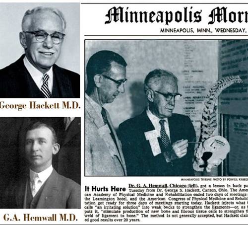 Proloterapi latince ‘’proliferasyon’’ ve ‘’terapi’’ kelimelerinden türemiştir. Ligament ve tendonların rejenerasyonunu tetikleyen bir enjeksiyon yöntemidir. Proloterapinin kökeni 2000 yıl öncesi, Hipokrat dönemine dayanır. Hipokrat yaralı bir askeri tedavi etmek için omzuna enjeksiyon yerine, kızgın demir batırma yöntemini kullanmıştır. 1930’lu yıllarda ABD’de uygulanmaya başlansa da Prolotherapy kelimesi ilk olarak proloterapinin babası olarak bilinen Dr. George Hackett tarafından 1950 yılında kullanılmıştır. Bu yıllarda Dr. Gustav Hemwall (Dr. Hackett’in ilk öğrencisi) proloterapiyi öğrenmek için Dr. Hackett ile birlikte çalışmıştır. Dr. Hemwall 1989 yılında ölünceye kadar dünyaya proloterapiyi öğreten kişi olmuştur. Dr. Hemwall çalışmalarında hastaların %82’sinde ağrı remisyonu sağladığını belirtmiştir. 1960’lı yıllara gelindiğinde Dr. Hemwall, Hackett Vakfı’nın kurulmasına öncülük etmiştir, daha sonra bu vakfın adı Hackett-Hemwall Vakfı olarak değiştirilmiş ve günümüzde hala bu isimle tedavi hizmeti alamayan insanlara ulaşmayı amaçlayan bir yapıda çalışmaktadır. Dr. Hemwall, bugün proloterapiyi uygulamakta olan Jeffrey Patterson, Rodney Van Pelt, K. Dean Reeves ve Ross A. Hauser gibi proloterapistleri yetiştirmiştir.